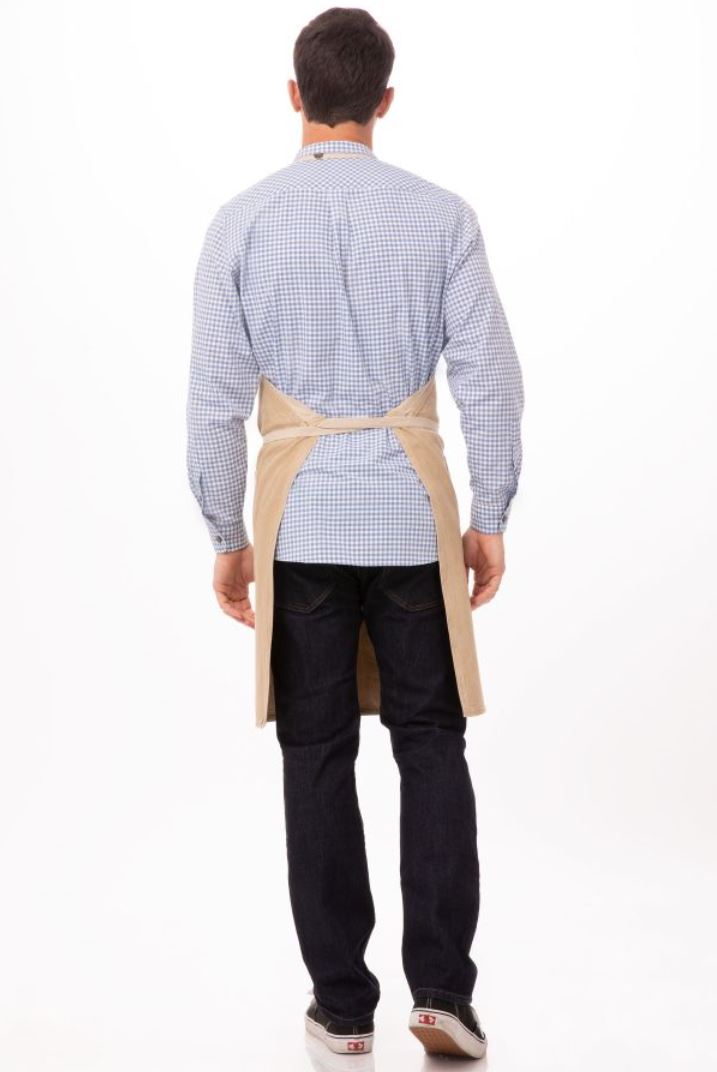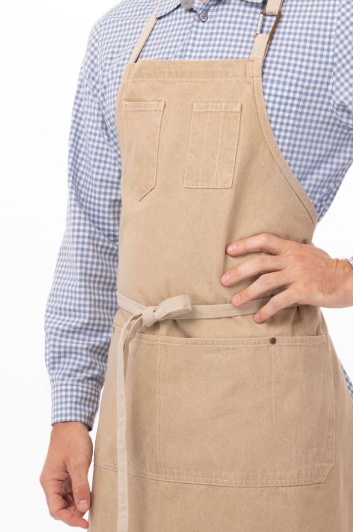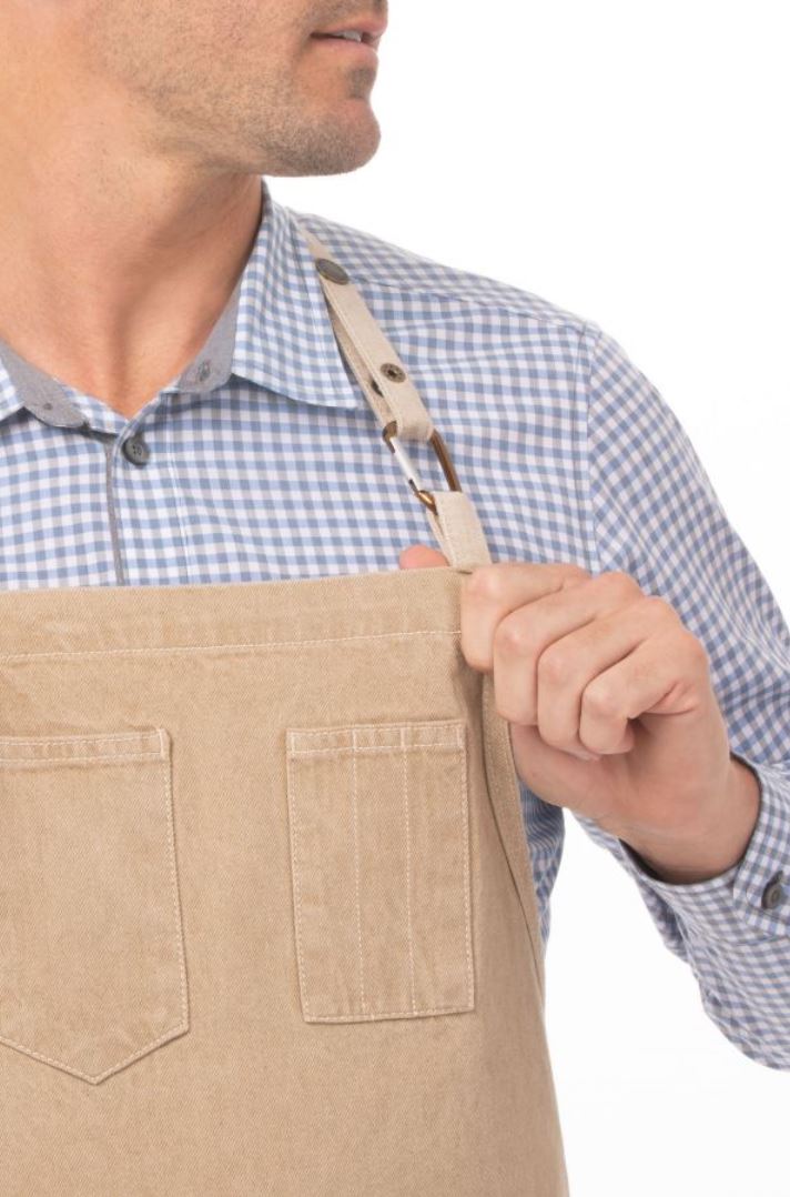 Die Austin-Denim Latzschürze ist in einem schönen Natur Ton gehalten, ideal passend zu unseren Urbanstyle Shirts, oder unsere Hartford- und Springfield-Kochjacken.