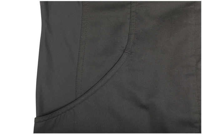 Cool Vent™-Einsätze an den Seiten bis hoch zu den Schultern„lite“-Twill-GewebeStehkragenKurzarmEinreihiges Design mit verdecktem YKK-ReißverschlussLatzschürzenschlaufe im Nacken mit graviertem DruckknopfAbgerundete, zweiteilige Thermometertasche auf dem linken OberarmAbgerundete Handy- oder Notizblocktasche auf dem rechten OberarmSeitliche Bequemlichkeitsschlitze