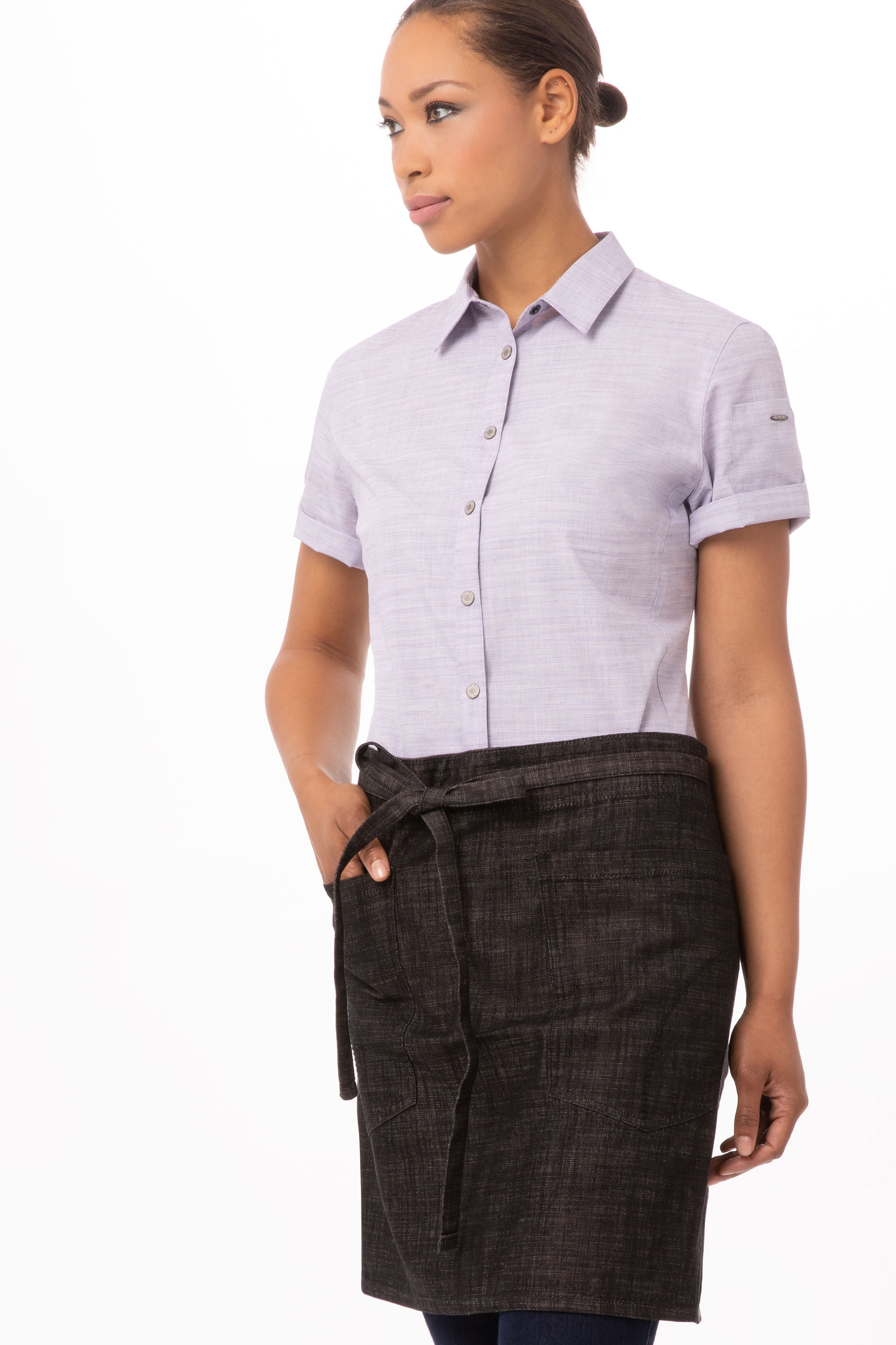 Moderne taillierte Kurzarm-Bluse aus einem leichtem Polyester/Baumwoll-Material. Dank abgerundetem Saum auch über der Hose tragbar. In fünf Pastelltönen erhältlich. Perfekt für jeden Service-Profi, der nach einem Update sucht.KurzarmZwei RückenfaltenLatzschürzenhalter im Nacken mit SchnappverschlussSeitlicher abgerundeter SaumUrbanstyle DruckknöpfeTasche am linken Oberarm