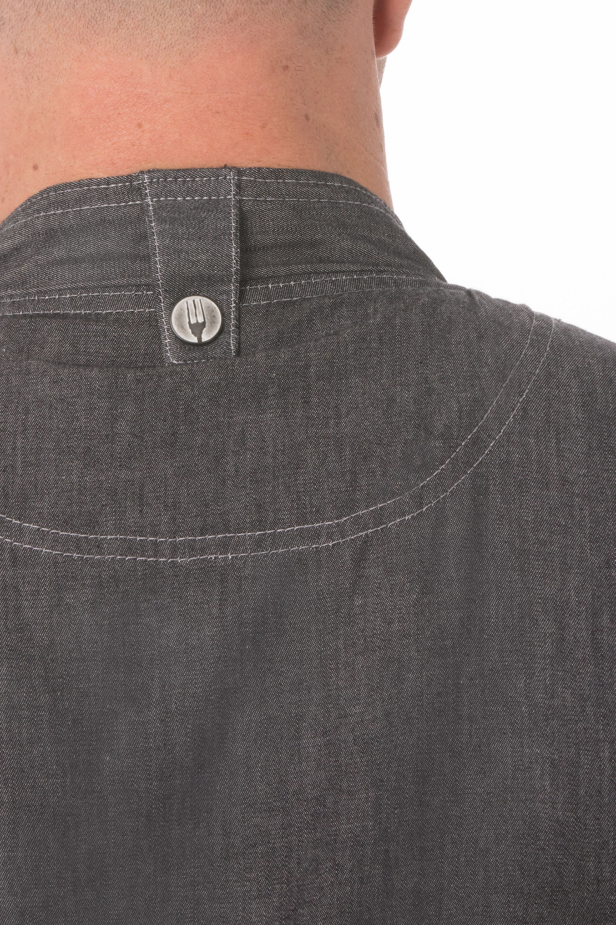 - Latzschürzenschlaufe im Nacken mit graviertem Druckknopf