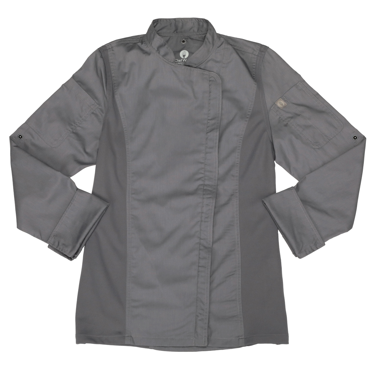 Kochjacke aus einem "lite" Twill-Stoff mit Cool Vent™-Einsätzen bis hoch zu den Schultern, mit Seitennahtschlitze für mehr Flexibilität, einreihigem Design und verstecktem Reißverschluss, Roll-Up Ärmeln, einer Latzschürzenschlaufe im Nacken, einer zweigeteilten Oberarmtasche links und einer großen Oberarmtasche rechts.