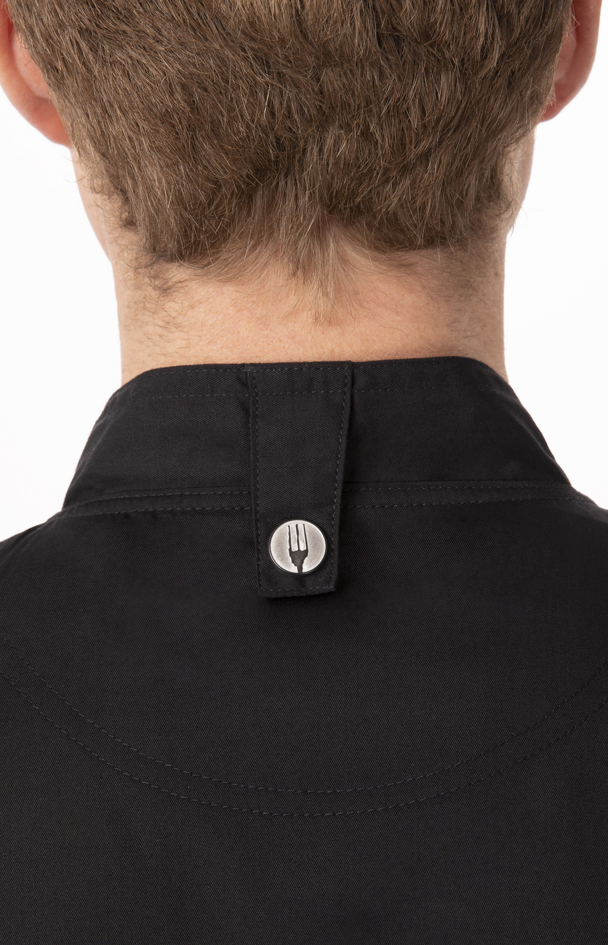 - Latzschürzenschlaufe im Nacken mit graviertem Druckknopf