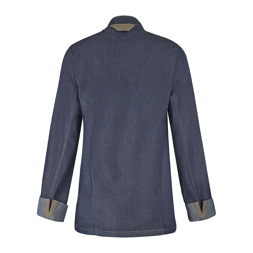Damen-Jeans-Kochjacke. Fünf gewölbte Druckknöpfe in Holzoptik vorne mittig. Zwei aufgesetzte Taschen unten mit abgeschrägten Ecken. Paspelierte Brusttasche mit beigefarbener Borte. Stehkragen. Kontrast-Farben Bündchen mit Jeansstoff an der Unterseite. Direkte Stickerei „LAFONT blau/weiß/rot“ auf dem linken Oberarm.