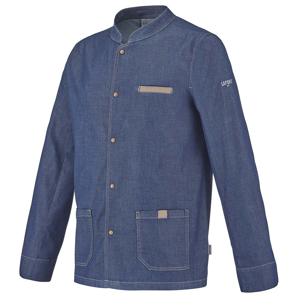 Gerade geschnittene Herren-Jeansjacke. Fünf gewölbte Druckknöpfe in Holzoptik vorne mittig. Zwei aufgesetzte Taschen unten mit abgeschrägten Ecken. Paspelierte Brusttasche mit beigefarbener Borte. Stehkragen. Kontrastfarbene Ärmelbündchen mit Denim-Unterseite. Direkte Stickerei „LAFONT blau/weiß/rot“ auf dem linken Oberarm.