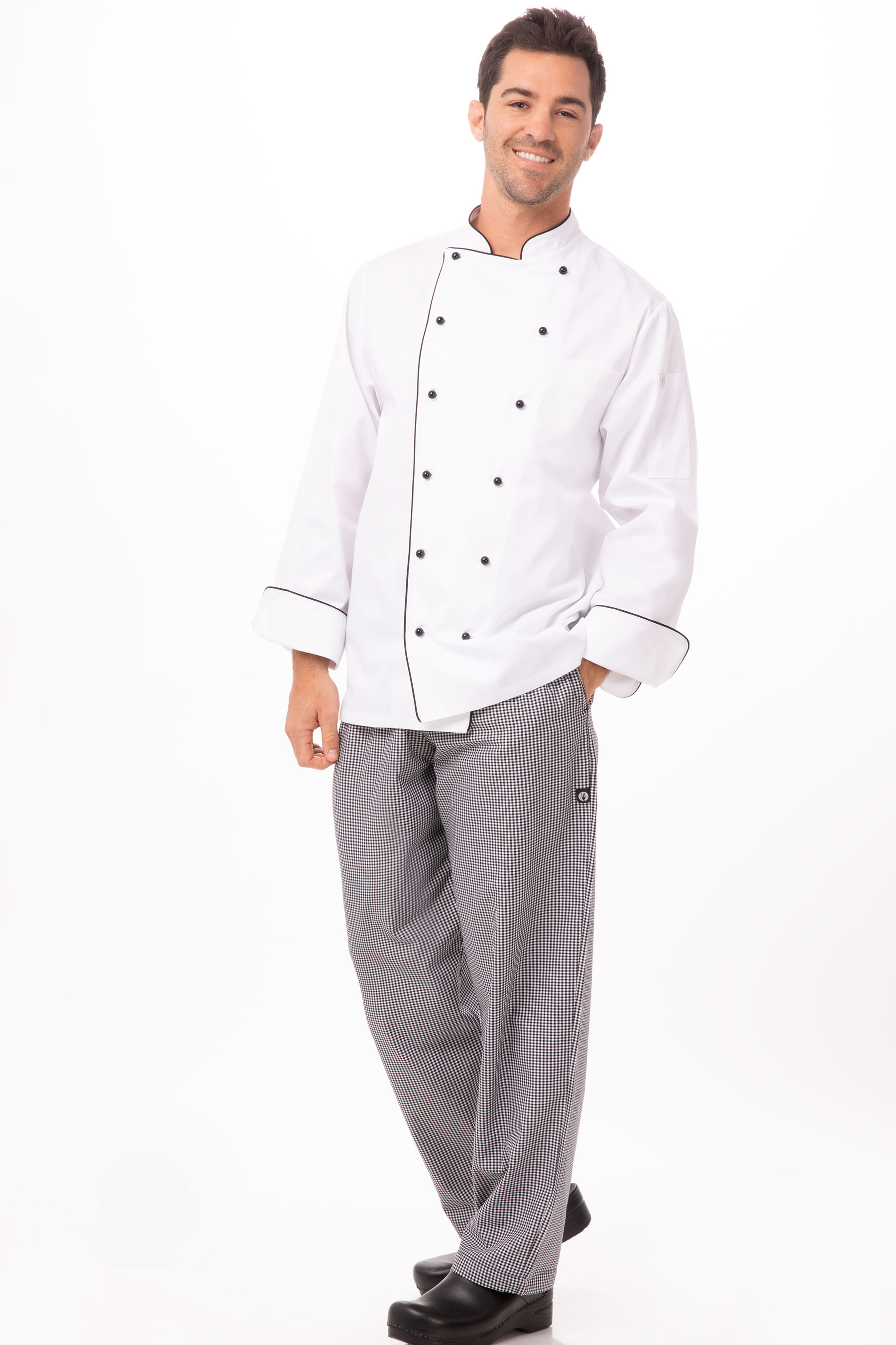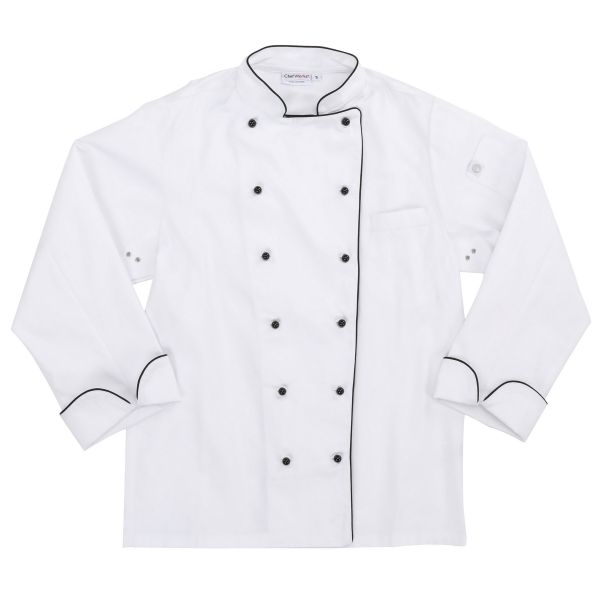 Unsere Executive Chef Coats kombinieren gekonnt gefertigte Details, eine Vielzahl von Schnitten und hochwertige Stoffe, um klassische und moderne Styles zu kreieren, die so einzigartig sind wie du. Die Newport Executive Chef Coat verfügt über französische Manschetten und Belüftungsöffnungen unter den Armen. Die langärmlige, zweireihige Kochjacke hat schwarze Paspeln am Kragen, in der Mitte vorne und an den Manschetten. Der Newport Executive Chef Coat verfügt außerdem über zwei abnehmbare schwarze Knopfleisten.