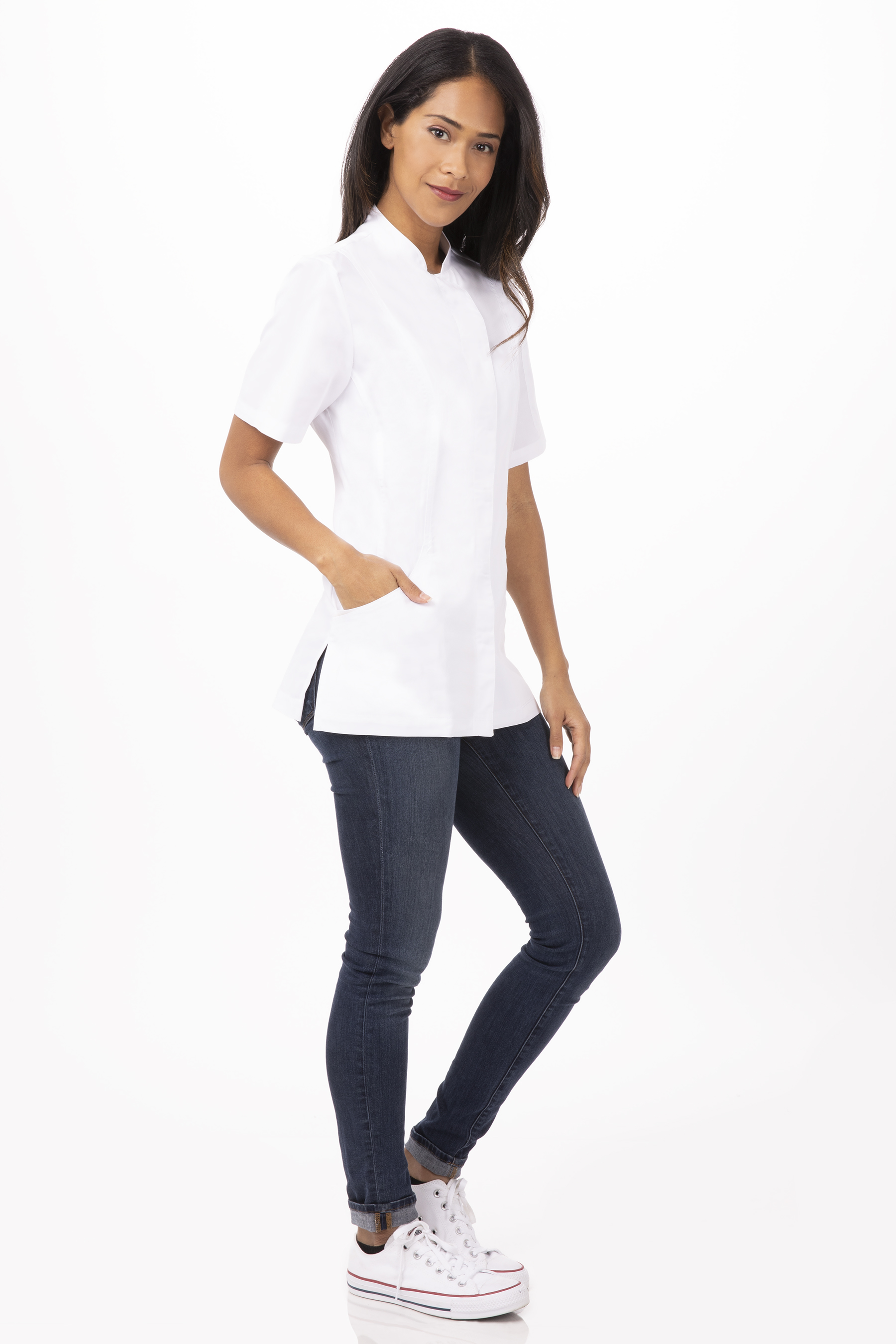 Cool Vent ™-Einsätze in den Seiten und am RückenKurzarmEinreihig mit verdecktem SchnappverschlussSeitennahtschlitzeSchürzenhalter am hinteren Kragen mit SchnappverschlussLinke ÄrmeltascheVersteckte Fronttaschen mit Reißverschluss