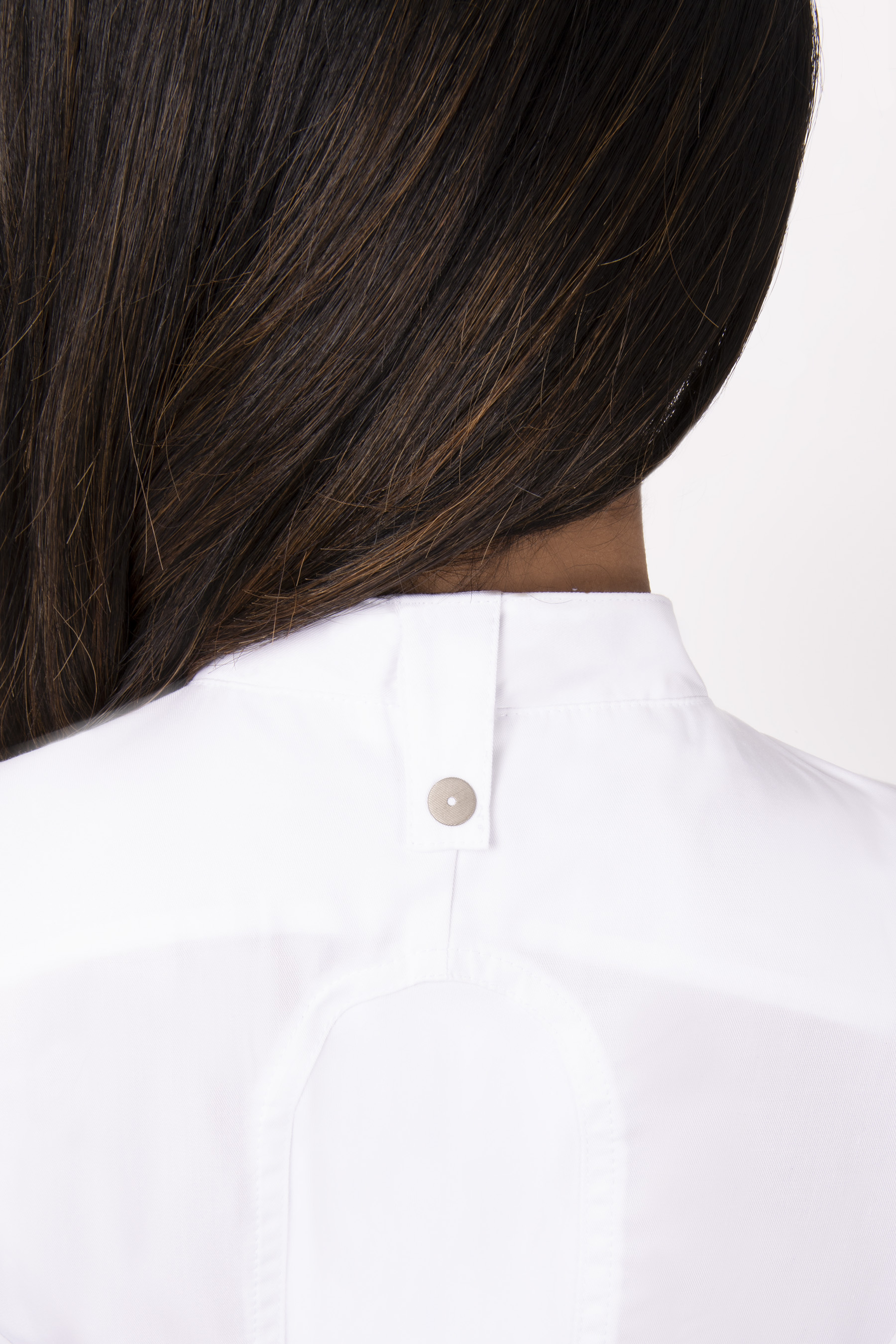 - Schürzenhalter am rückseitigen Kragen und graviertem Druckknopf